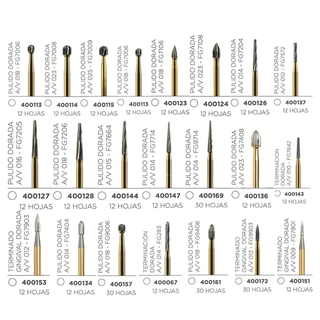 Fabricadas en carburo de tungsteno de alta calidad, las fresas Jet (Kerr) de alta velocidad garantizan un corte preciso, seguro y duradero. Disponibles en versiones de 12 y 30 hojas, se adaptan a distintas necesidades clínicas, brindando un desempeño confiable y eficiente en cada procedimiento.